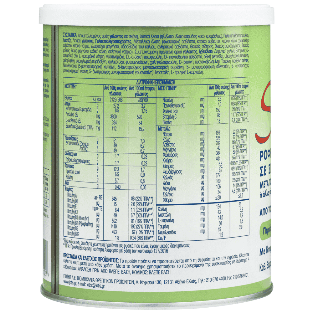 Απομεταλλωμένος ορός γάλακτος σε σκόνη, Φυτικά έλαια (ηλιέλαιο, έλαιο καρύδας κοκό, κραμβέλαιο), Γάλα αποβουτυρωμένο, Λακτόζη, Λιπαρά γάλακτος, Γαλακτοολιγοσακχαρίτες, Μεταλλικά άλατα (φωσφορικό ασβέστιο, κιτρικό ασβέστιο, κιτρικό κάλιο, χλωριούχο ασβέστιο, κιτρικό νάτριο, χλωριούχο μαγνήσιο, υδροξείδιο του καλίου, ανθρακικό ασβέστιο, θειικός σίδηρος, θειικός ψευδάργυρος, θειικός χαλκός, θειικό μαγγάνιο, ιωδικό κάλιο, σεληνικό νάτριο), Συμπυκνωμένη πρωτεΐνη ορού γάλακτος, Ιχθυέλαιο, Διτρυγική χολίνη, Βιταμίνες (L-ασκορβικό οξύ, L- ασκορβικό νάτριο, νικοτιναμίδιο, DL-α-οξική τοκοφερόλη, D- παντοθενικό ασβέστιο, οξική ρετινόλη, υδροχλωρική θειαμίνη, ριβοφλαβίνη, υδροχλωρική πυριδοξίνη, φολικό οξύ, φυτομεναδιόνη, χοληκαλσιφερόλη, D- βιοτίνη, κυανοκοβαλαμίνη), Ταυρίνη, Λεκιθίνη σόγιας, Νουκλεοτίδια (5-μονοφωσφορική κυτιδίνη, 5-δινατριούχος μονοφωσφορική ουριδίνη, 5- μονοφωσφορική αδενοσίνη, 5- δινατριούχος μονοφωσφορική ινοσίνη, 5- δινατριούχος μονοφωσφορική γουανοσίνη), Ινοσιτόλη, L- τρυγική L-καρνιτίνη.