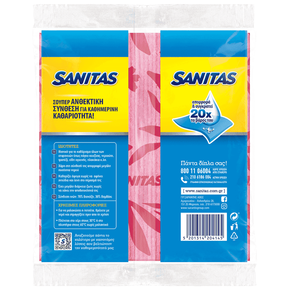 Η σπογγοπετσέτα γενικής χρήσης Sanitas Ultra Absorb με τη σούπερ ανθεκτική σύνθεση για καθημερινή καθαριότητα, απορροφά και συγκρατεί 20 φορές το βάρος της σε νερό! Είναι Ιδανική για το καθάρισμα όλων των επιφανειών όπως πάγκο κουζίνας, νεροχύτη, τραπέζι, είδη υγιεινής, πλακάκια κ.α. χωρίς να αφήνει χνούδια και ίχνη στο πέρασμά της. Διατίθεται σε πολυσυσκευασία. Απορροφά 20 φορές το βάρος της σε νερό. Ενισχυμένη αντοχή. Γρήγορο στέγνωμα. Με βαμβάκι. 100% βιοδιασπώμενο και κομποστοποιήσιμο.