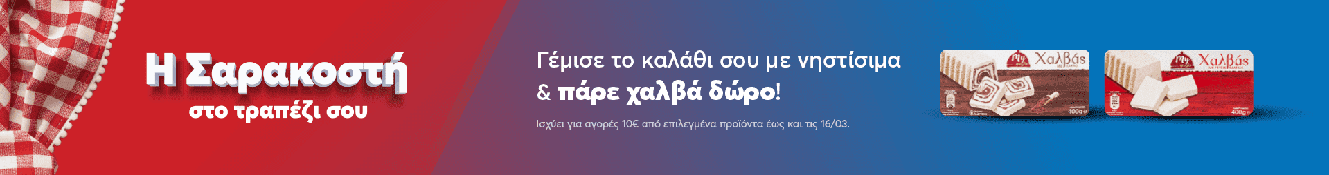 Με την αγορά αξίας 10€ από τα προϊόντα με τη σήμανση “Αγόρασε & Κέρδισε”, δώρο μία συσκευασία χαλβά της επιλογής σου.
