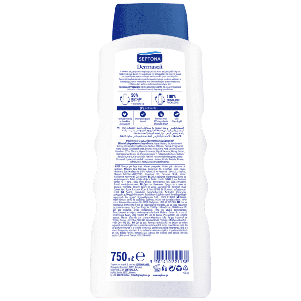 Aqua (Water), Sodium Laureth Sulfate, Cocamidopropyl Betaine, Sodium Chloride, Parfum (Fragrance), Alpha-Glucan Oligosaccharide, Benzoic Acid, Citric Acid, Coco-Glucoside, Disodium EDTA, Glycerin, Glycol Distearate, Glycol Stearate, Honey Extract, Hydrogenated Castor Oil, Polyquaternium-7, Potassium Sorbate, Sodium Benzoate, Citral, Citrus Limon Peel Oil, Hexamethylindanopyran, Hexyl Cinnamal, Hydroxycitronellal, Limonene, Linalool, Linalyl Acetate, Pinene, Tetramethyl Acetyloctahydronaphthalenes