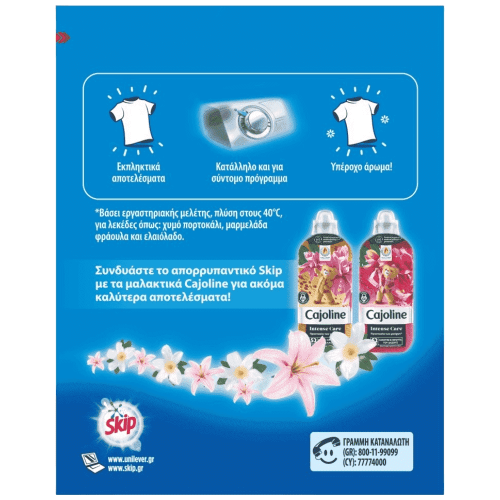 Το Skip Active Clean με 100% φυσικής προέλευσης ένζυμα χαρίζει εκπληκτικά αποτελέσματα με την πρώτη πλύση! Αφαιρεί δύσκολους λεκέδες χαρίζοντας στα ρούχα σας ασύγκριτη καθαριότητα! Η πρωτοπόρα σύνθεσή του το καθιστά αποτελεσματικό και στο σύντομο πρόγραμμα! Μια δοκιμή θα σας πείσει!