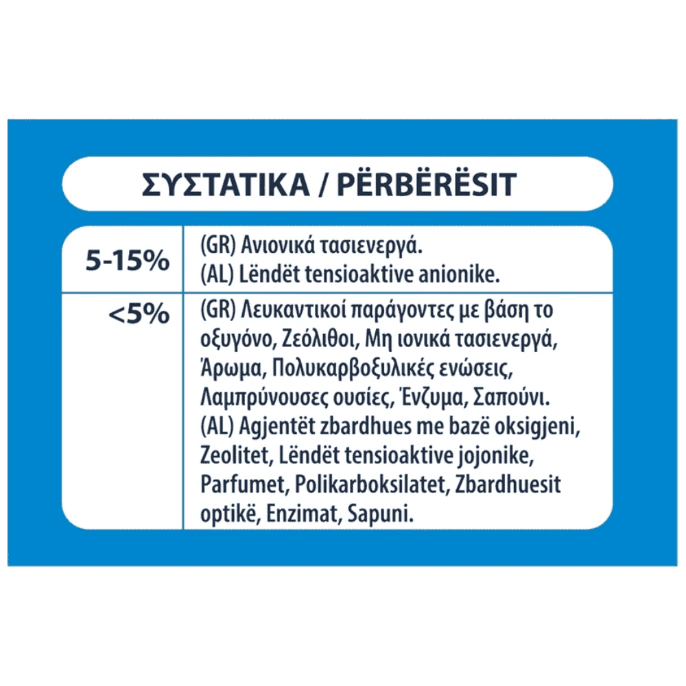 5-15% Ανιονικά τασιενεργά, <5% Λευκαντικοί παράγοντες με βάση το οξυγόνο, Ζεόλιθοι, Μη ιονικά τασιενεργά, Άρωμα, Πολυκαρβοξυλικές ενώσεις, Λαμπρύνουσες ουσίες, Ένζυμα, Σαπούνι.