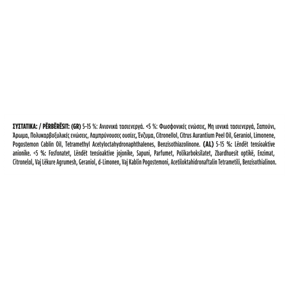 5-15%: Aνιονικά τασιενεργά. 5%: Φωσφονικές ενώσεις, Μη ιονικά τασιενεργά, Σαπούνι, Άρωμα, Πολυκαρβοξυλικές ενώσεις, Λαμπρύνουσες ουσίες, Ένζυμα, Citronellol, Geraniol, Hexyl Cinnamal, Limonene, Methylisothiazolinone, Octylisothiazolinone.Αλλεργιογόνα