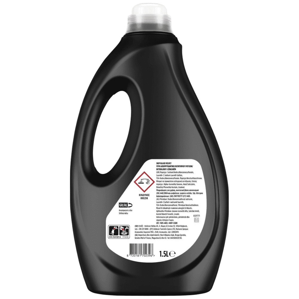 Το Skip Black Velvet για έντονα μαύρα και σκουρόχρωμα ρούχα, με ειδικά σχεδιασμένη σύνθεση με care elixir 2 σε 1, βοηθάει να διατηρούνται τα μαύρα και σκούρα χρώματα ζωντανά ενώ παράλληλα απομακρύνει τους κόμπους για να έχουν τα ρούχα σας λαμπερή όψη. Φροντίδα και καθαριότητα για ρούχα που δείχνουν σαν καινούρια!