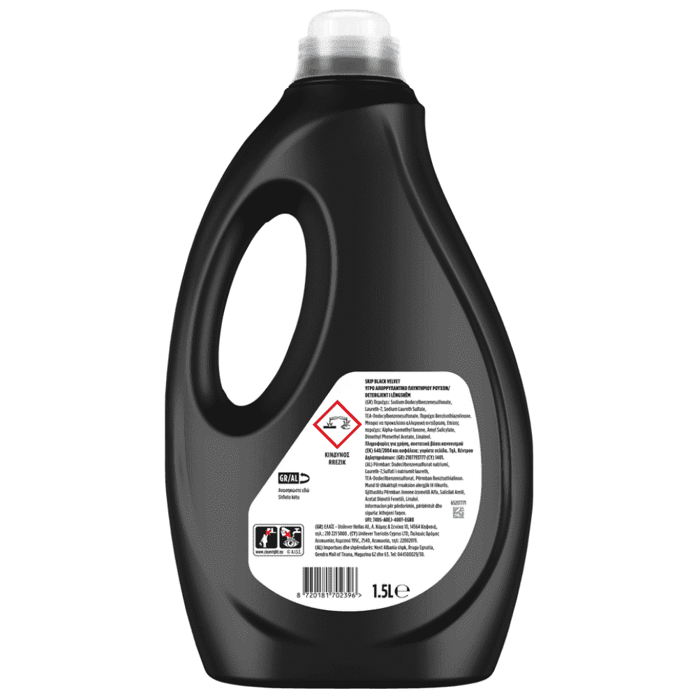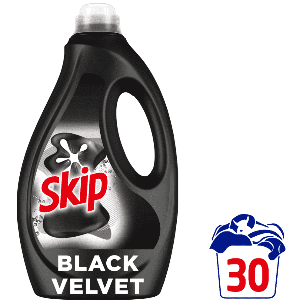 Το Skip Black Velvet για έντονα μαύρα και σκουρόχρωμα ρούχα, με ειδικά σχεδιασμένη σύνθεση με care elixir 2 σε 1, βοηθάει να διατηρούνται τα μαύρα και σκούρα χρώματα ζωντανά ενώ παράλληλα απομακρύνει τους κόμπους για να έχουν τα ρούχα σας λαμπερή όψη. Φροντίδα και καθαριότητα για ρούχα που δείχνουν σαν καινούρια!