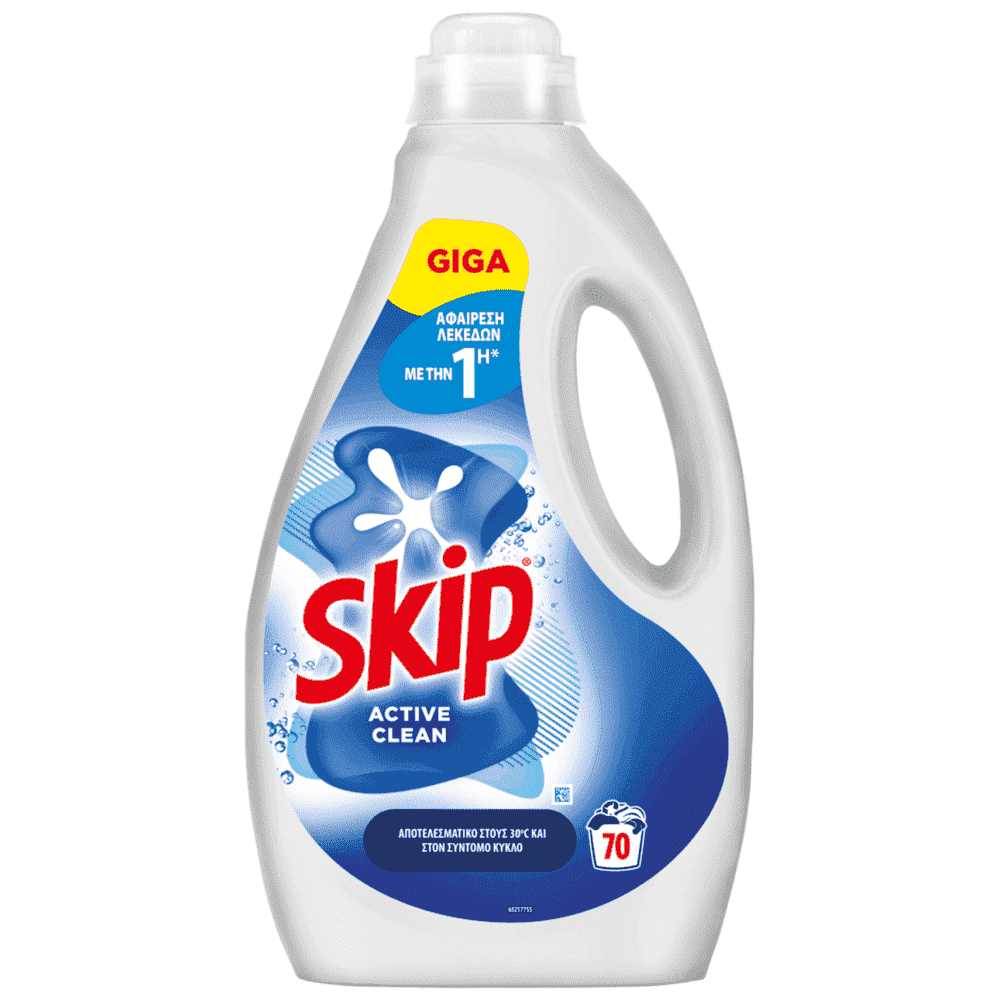 Το Skip Active Clean χαρίζει εκπληκτικά αποτελέσματα με την πρώτη πλύση! Αφαιρεί δύσκολους λεκέδες χαρίζοντας στα ρούχα σας ασύγκριτη καθαριότητα! Η πρωτοπόρα σύνθεσή του το καθιστά αποτελεσματικο και στο σύντομο πρόγραμμα! Μια δοκιμή θα σας πείσει!
