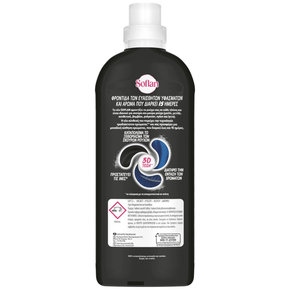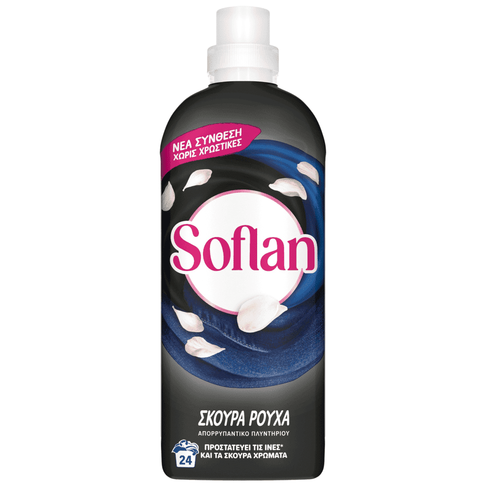 Το Soflan προσφέρει την καλύτερη φροντίδα του, ώστε τα σκούρα ρούχα σας να παραμείνουν σαν καινούρια για μεγάλο χρονικό διάστημα. Η προηγμένη σύνθεσή του Soflan για σκούρα ρούχα είναι ειδικά σχεδιασμένη για την φροντίδα των σκούρων και μαύρων ρούχων. Χάρη στη μοναδική σύνθεσή του το Soflan για σκούρα ρούχα παγιδεύει τα άλατα και άλλους παράγοντες που ξεθωριάζουν τα ρούχα, εξασφαλίζοντας έτσι έντονα μαύρα και λαμπερά σκούρα χρώματα. Χρησιμοποιήστε το για τα σκούρα και μαύρα ρούχα σας.