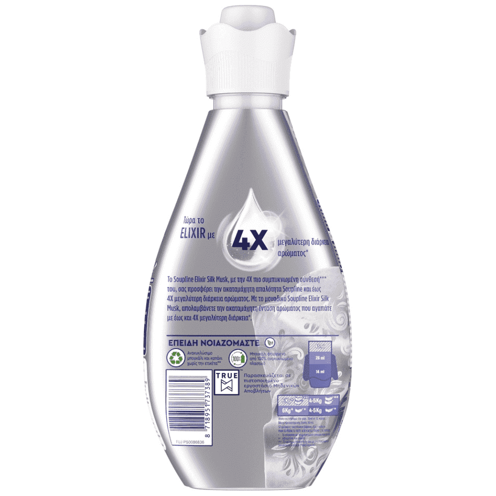 Το Soupline Elixir Silk Musk περιέχει υψηλή συγκέντρωση αρώματος, ώστε να απολαμβάνετε την ακαταμάχητη ένταση του αρώματος που αγαπάτε, χαρίζοντας εξαιρετική απαλότητα στα ρούχα σας. Το μοναδικό άρωμα Soupline Silk Musk Elixir περιέχει 2 φορές περισσότερο άρωμα που διαρκεί έως και 60 ημέρες.