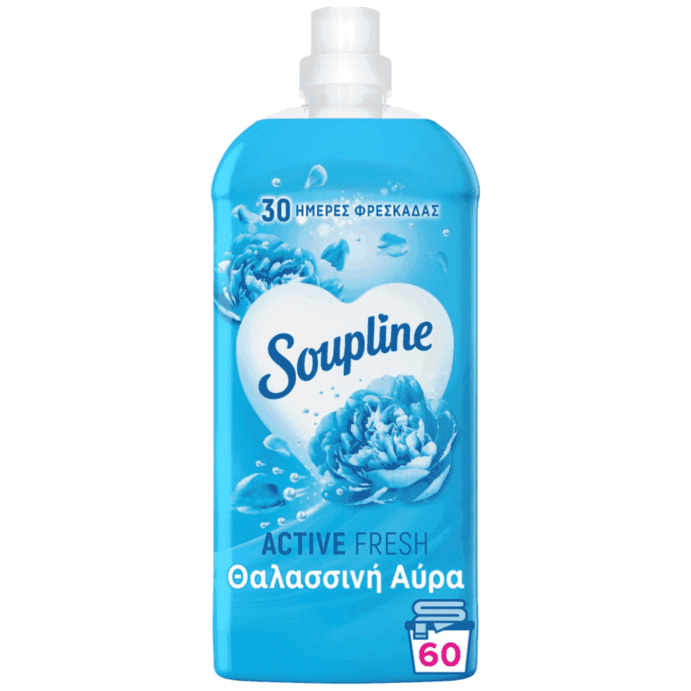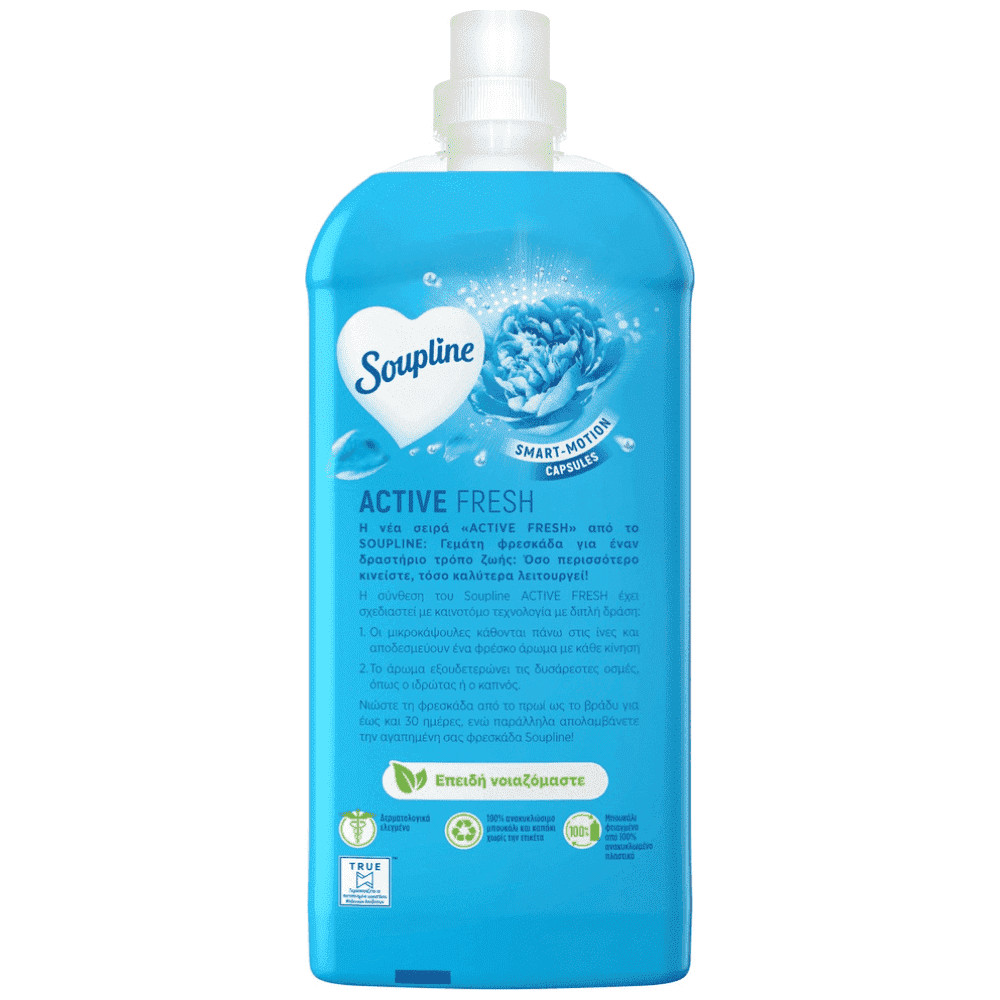 Η σύνθεση του Soupline ACTIVE FRESH έχει διπλή δράση: 1. Οι μικροκάψουλες κάθονται πάνω στις ίνες και αποδεσμεύουν ένα φρέσκο άρωμα με κάθε κίνηση 2. Το άρωμα εξουδετερώνει τις δυσάρεστες οσμές. όπως ο ιδρώτας ή ο καπνός. Νιώστε τη φρεσκάδα Soupline από το πρωί ως το βράδυ για έως και 30 ημέρες
