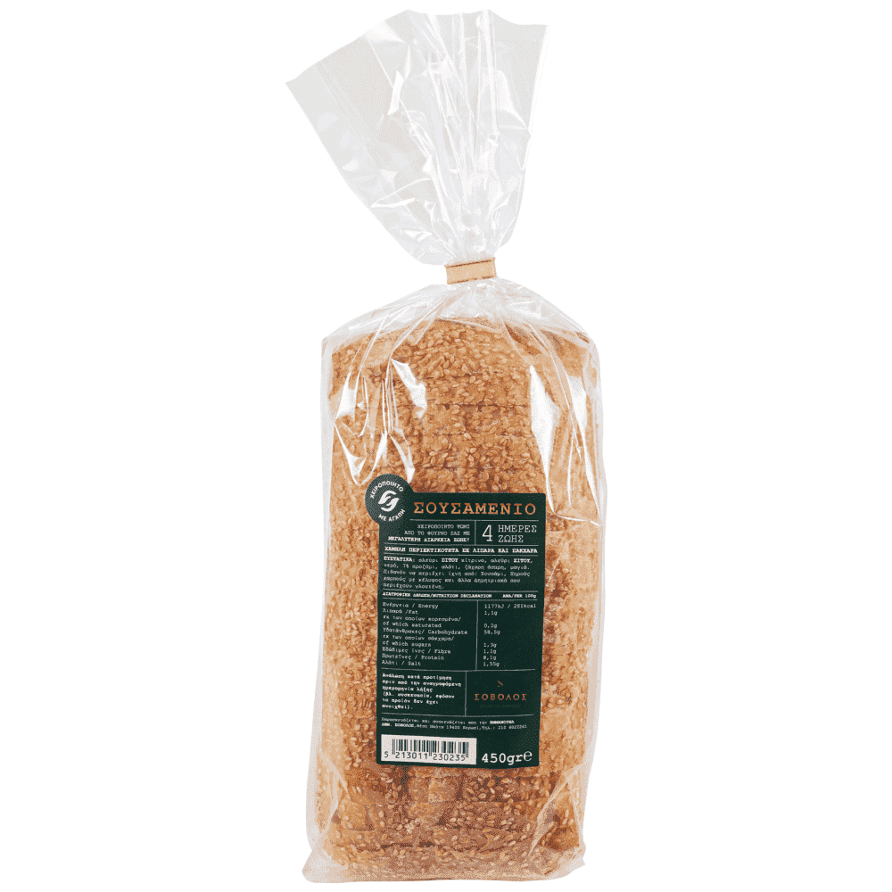 Το σουσαμένιο ψωμί Σόβολος μακράς ωρίμανσης και μακράς διάρκειας ζωής 4 ημερών, ξεχωρίζει για την αυθεντική του γεύση. Με την μαλακή, γεμάτη σουσάμι κόρα και την γλυκιά επίγευση του εσωτερικού του, γίνεται ιδανική επιλογή για κάθε γεύμα και κάθε ώρα της ημέρας.