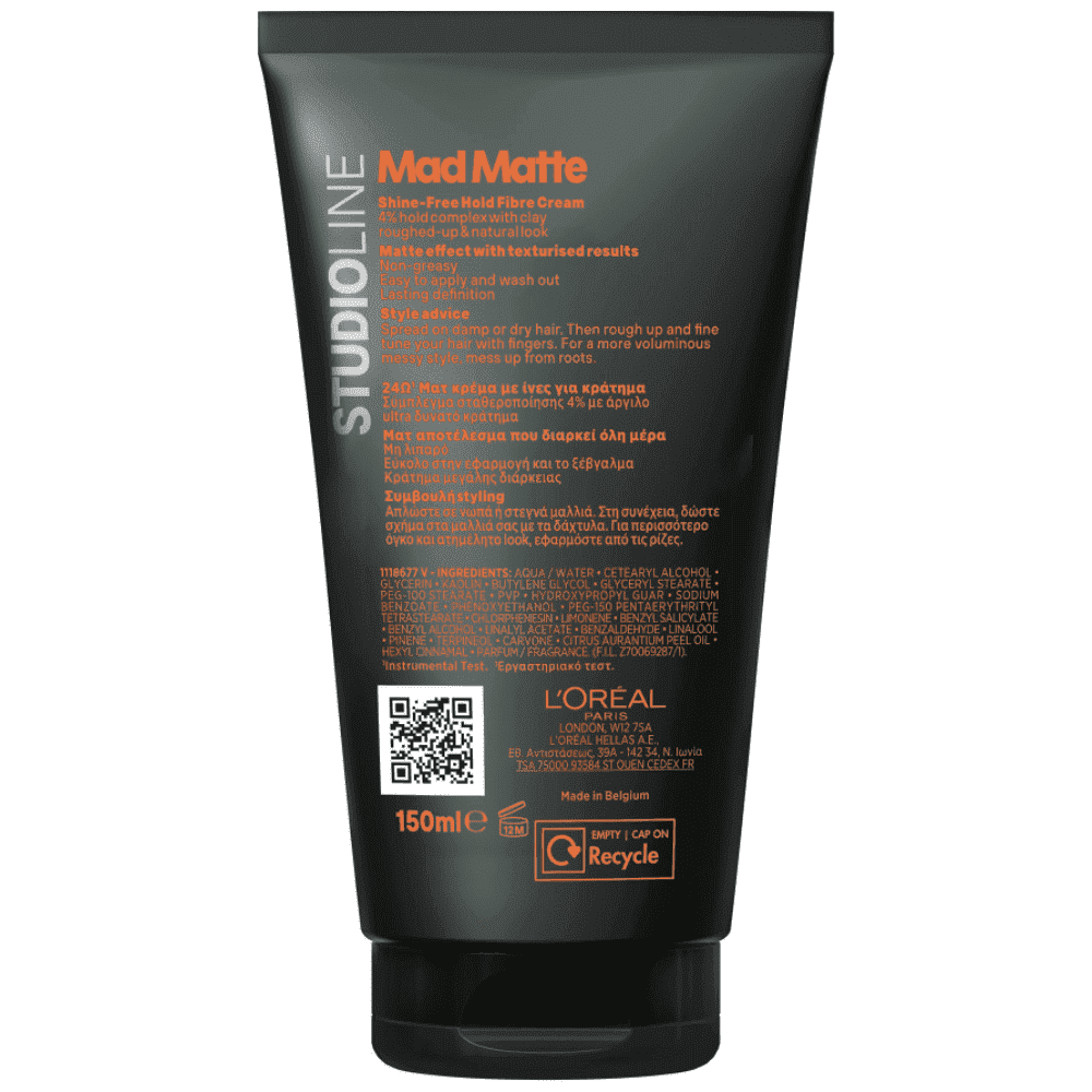 "Ανακάλυψε τη Mad Matte Fibre Cream από τη σειρά Studio Line: τη μοναδική κρέμα styling για το τέλειο '""επιμελώς ατημέλητο"" look με φυσικό αποτέλεσμα και ultra-matte τελείωμα. Αυτή η κρέμα με ίνες σου προσφέρει εντυπωσιακό, πολύ δυνατό κράτημα για έως και 24 ώρες, χάρη στο σύμπλεγμα κρατήματος 4% με άργιλο. Η μη λιπαρή σύνθεσή της εφαρμόζεται πανεύκολα και απομακρύνεται αμέσως στο λούσιμο, χωρίς να αφήνει κατάλοιπα ή να κολλάει. Δημιούργησε ένα φυσικό look με έντονη υφή και κίνηση που διαρκεί όλη μέρα με απόλυτη σταθερότητα και χωρίς καμία γυαλάδα. L'Oreal Paris, 14, rue Royale - 75008 Paris France.