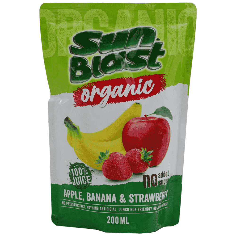 Φυσική γεύση, τριπλή απόλαυση! Ο βιολογικός ανάμεικτος χυμός Sun Blast με μήλο, μπανάνα και φράουλα συνδυάζει τρεις αγαπημένες φρουτένιες γεύσεις σε έναν χυμό - χωρίς προσθήκη ζάχαρης, χωρίς συντηρητικά και χωρίς τεχνητές χρωστικές.