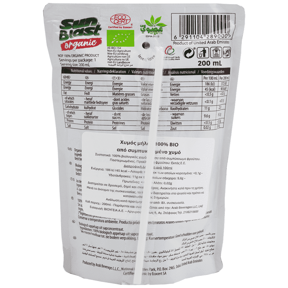 100% χυμός μήλου* από συμπύκνωμα φρούτου. (*= Προϊόν βιολογικής γεωργίας). Παστεριωμένος. Προέλευση φρούτου: εκτός Ε.Ε.