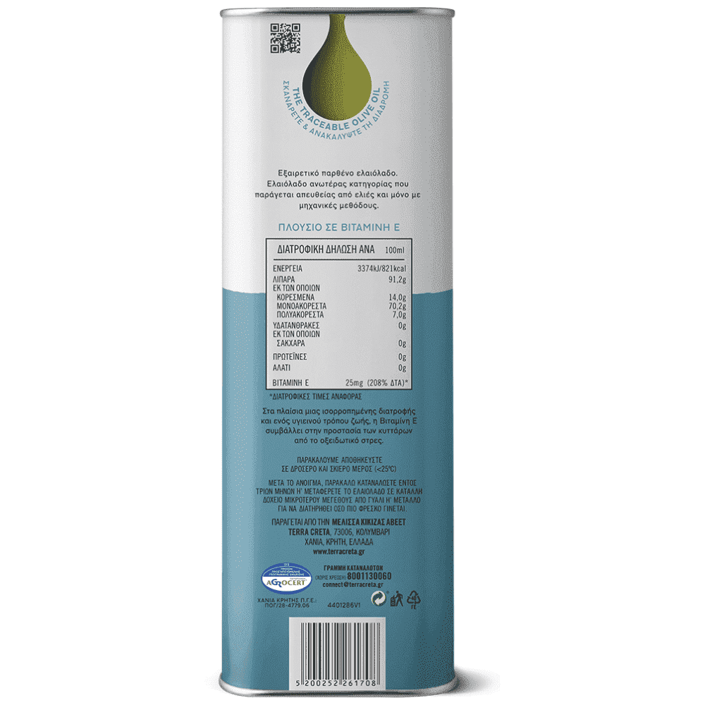 Εξαιρειτκά Παρθένο ελαιόλαδο. Ελαιόλαδο ανωτέρας κατηγορίας που παράγεται απευθείας από ελι΄ςσ και μόνο με μηχανικές μεθόδους. Στα πλαίσια μιας ισορροπημένης διατροφής και ενος υγιεινού τρόπου ζωής, η βιταμίνη Ε συμβάλλει στην προστασία των κυττάρων από το οξειδωτικό στρες.