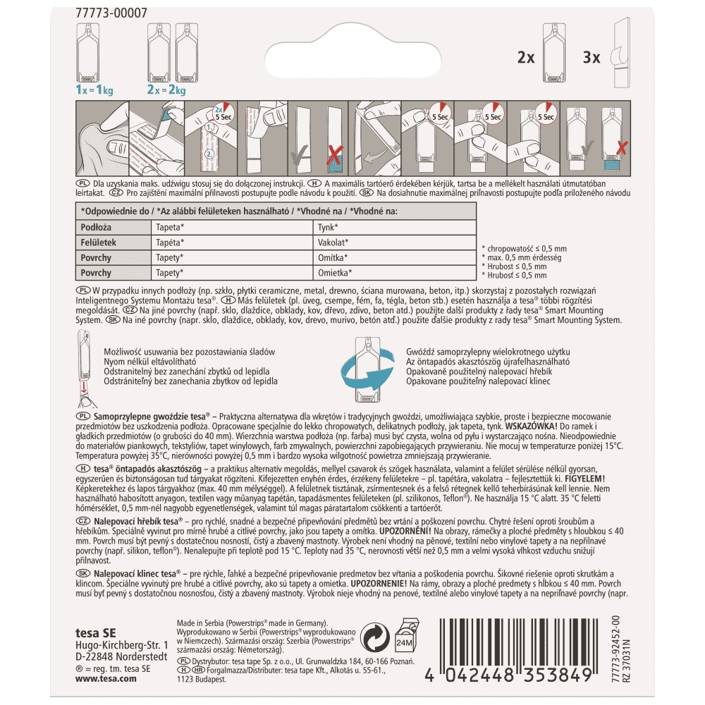 When it comes to hanging pictures and decorations on sensitive and textured surfaces without causing any damage, look no further than the tesa Adhesive Nail for Wallpaper & Plaster 1 kg. Each nail can, as the name implies, reliably hold 1 kg and two of them can hold 2 kg, and what’s more they’re removable without leaving a trace.How to use Step by step1. Clean your surface with a dust-free cloth to ensure the best possible bond.2. Apply the Adhesive Strip to the surface. The blue tab should be at the bottom facing the wall. Press down firmly all over for five seconds, then remove the protective foil.3. Align the top of the Adhesive Nail with the upper edge of the Adhesive Strip, checking that the nail head is at the top. Fold it down onto the adhesive surface right above the grey line and then press firmly and evenly all over for another five seconds.4. Make sure the tab is accessible as you’ll need it when (or if) you remove the nail.Get your pictures mounted without damaging your wallpapertesa Adhesive Nails for Wallpaper & Plaster have been designed especially for textured and sensitive surfaces, where more traditional techniques would be likely to cause damage. You won’t need any tools so there’s no noise or mess, and you’ll find everything you need to get your item up on the wall is included in the pack. Easy to use even easier to remove As and when you want to move things around, grab the nail head in one hand and the tab in the other. Stretch the strip straight down, parallel to the wall. Don't press the nail onto the surface - instead pull it straight downwards towards the floor (NOT away from the surface or diagonally).This motion releases the thousands of tiny bonds that make up the adhesive surface. Use them again and againYou can use an Adhesive Nail again and again, so it’s good for your bank balance and the environment too. Just pick up a refill pack of tesa Adhesive Strips for Wallpaper & Plaster from your tesa Smart Mounting System retailer.For solutions to mount on glass, brick, tiles and other surfaces, please use the tesa Product Finder and refer to our other tesa Smart Mounting Solutions.Not suitable for any non-stick materials.