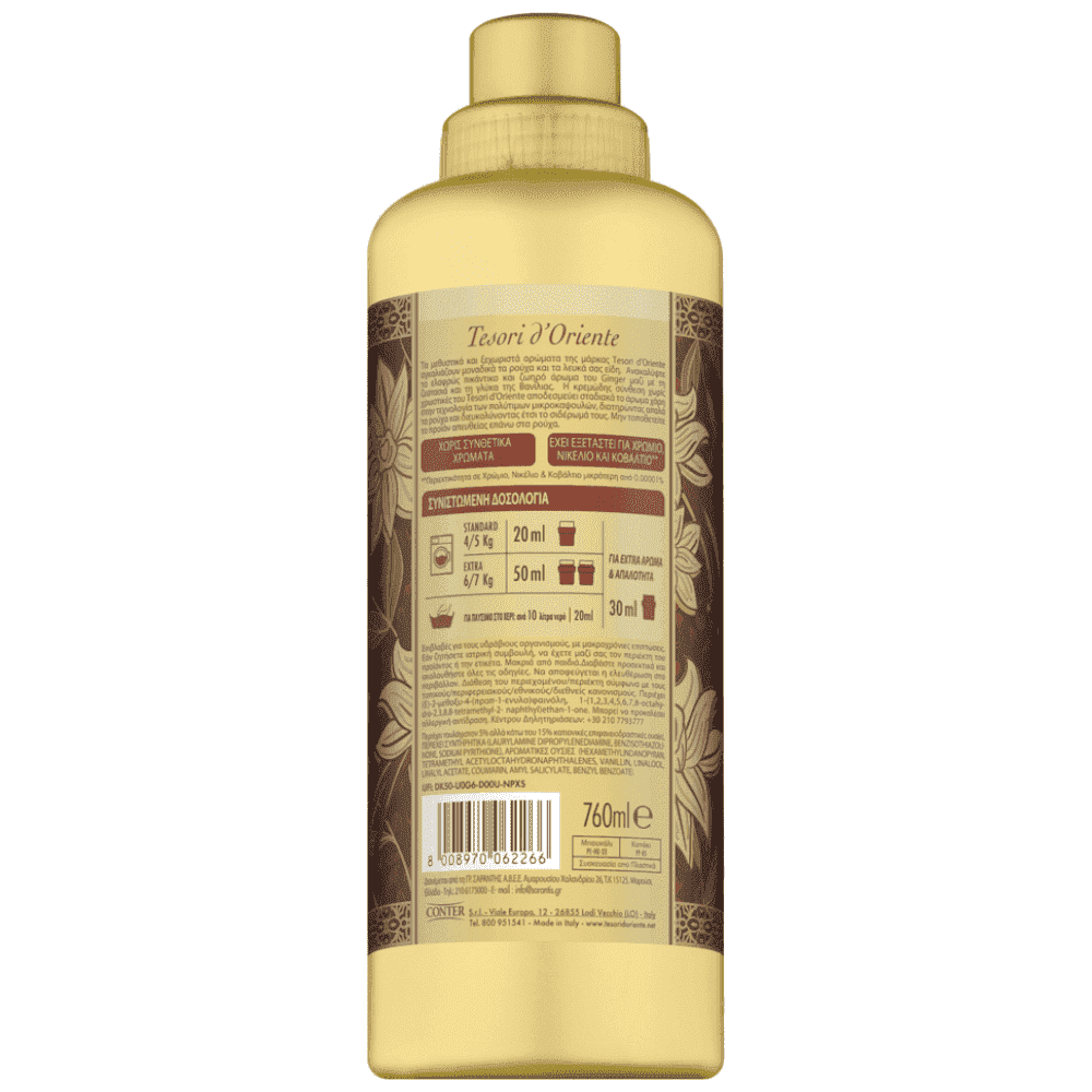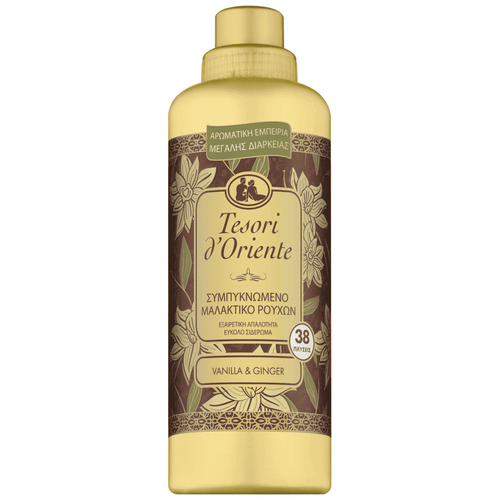Τα μεθυστικά και ξεχωριστά αρώματα της μάρκας Tesori d'Oriente αγκαλιάζουν μοναδικά τα ρούχα και τα λευκά σας είδη. Ανακαλύψτε το ελαφρώς πικάντικο και ζωηρό άρωμα του Ginger μαζί με τη ζεστασιά και τη γλύκα της Βανίλιας. Η κρεμώδης σύνθεση χωρίς χρωστικές του Tesori d'Oriente, αποδεσμεύει σταδιακά το άρωμα χάρη στην τεχνολογία των πολύτιμων μικροκαψουλών, διατηρώντας απαλά τα ρούχα και διευκολύντας έτσι το σιδέρωμα τους. ΑΡΩΜΑΤΙΚΗ ΕΜΠΕΙΡΙΑ, ΜΕΓΑΛΗΣ ΔΙΑΡΚΕΙΑΣ ΕΩΣ ΚΑΙ 8 ΕΒΔΟΜΑΔΕΣ.