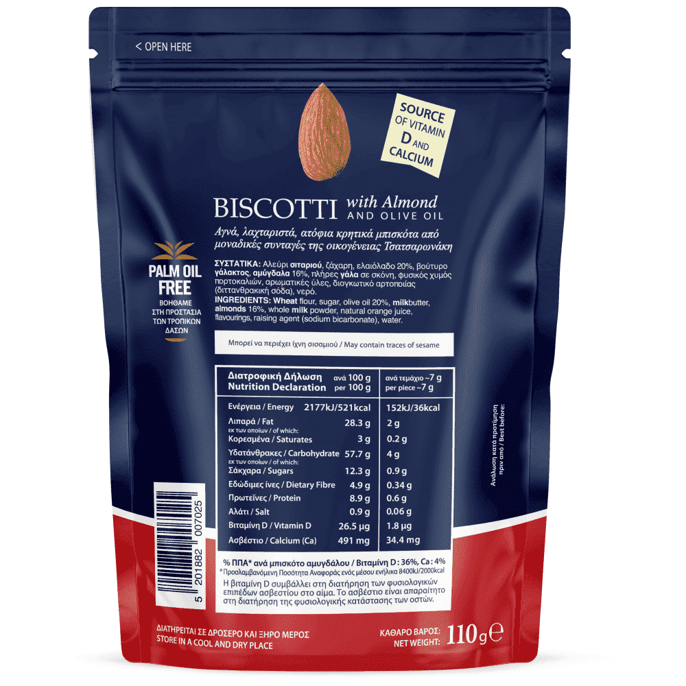 Το προϊόν BISCOTTI αποτελεί ένα πολύ νόστιμο και θρεπτικό προϊόν της σειράς προϊόντων «το Μάννα». Συνδυάζει το αμυγδάλο με κάποια από τα διατροφικά χαρακτηριστικά του ελαιόλαδου. Αποτελεί ένα τρόπο να καλύψουμε την επιθυμία για γλυκιά γεύση, προσφέροντας στον οργανισμό μας καλά διατροφικά συστατικά.