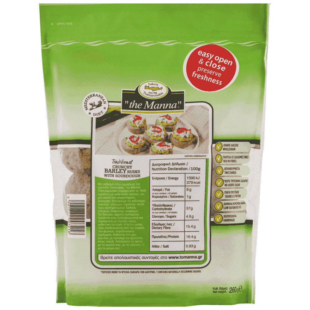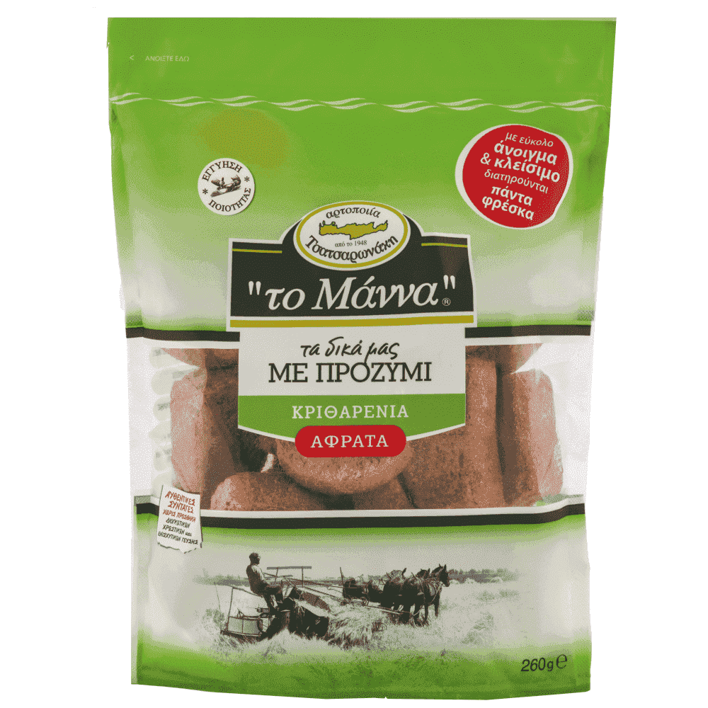 Το προϊόν Κριθαρένιο αφράτο με προζύμι περιέχει και μια ειδική ποικιλία κριθαριού. Το είδος του κριθαριού που περιέχει δίνει μια αυξημένη περιεκτικότητα αδιάλυτων φυτικών ινών σε σχέση με τα υπόλοιπα κριθαρένια παξιμάδια. Τόσο η μεγαλύτερη περιεκτικότητά του σε αδιάλυτες φυτικές ίνες (πίτουρο), όσο και το μεγαλύτερο μέγεθος, το καθιστούν αποτελεσματικότερο για τη σωστή λειτουργία του εντέρου.