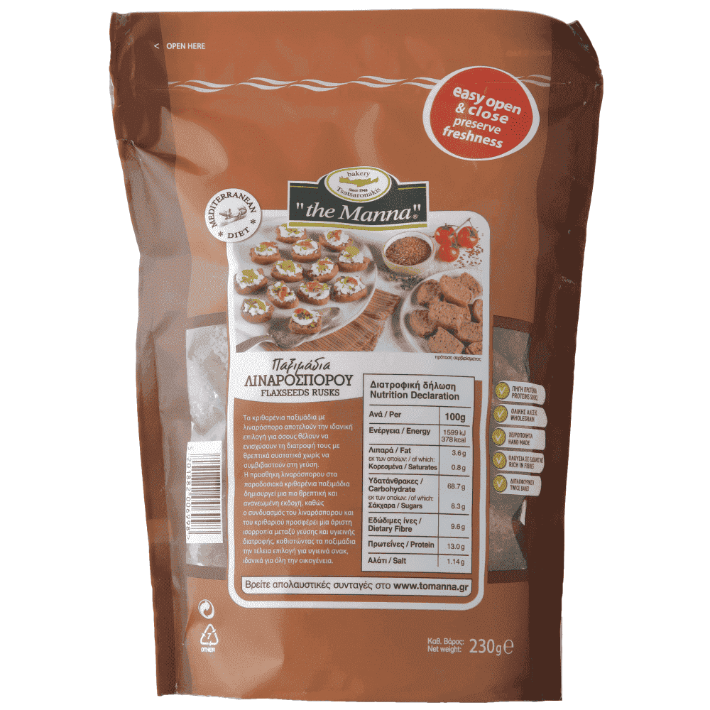 Τα κριθαρένια παξιμάδια με λιναρόσπορο είναι μια εξαιρετική επιλογή για όσους θέλουν να ενισχύσουν τη διατροφή τους με υγιεινά συστατικά χωρίς να θυσιάσουν τη γεύση. Η προσθήκη λιναρόσπορου στα παραδοσιακά κριθαρένια παξιμάδια προσφέρει μια ανανεωμένη και πιο θρεπτική εκδοχή τους, αφού ο λιναρόσπορος αποτελεί πηγή Ωμέγα-3 λιπαρών οξέων ,πρωτεϊνών και βιταμινών του συμπλέγματος Β, έχει υψηλή περιεκτικότητα σε φυτικές ίνες και είναι ενισχυμένος με αντιοξειδωτικά . Η συνδυασμένη δύναμη του λιναρόσπορου και του κριθαριού προσφέρει μια ιδανική ισορροπία υγιεινής διατροφής και γεύσης και καθιστά τα παξιμάδια το τέλειο υγιεινό σνακ για όλη την οικογένεια.