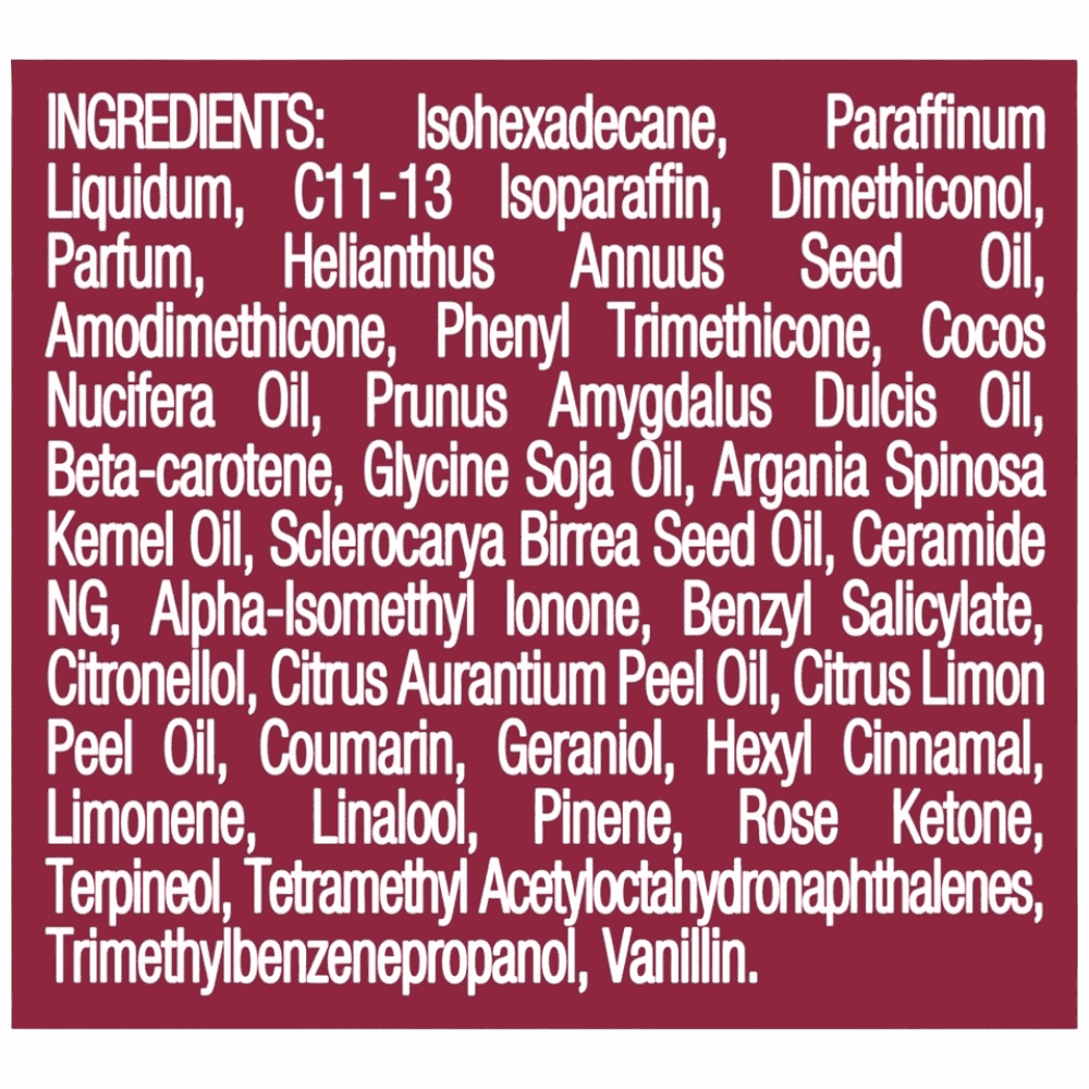 Isohexadecane, Paraffinum Liquidum, C11-13 Isoparaffin, Dimethiconol, Parfum, Helianthus Annuus Seed Oil, Amodimethicone, Phenyl Trimethicone, Cocos Nucifera Oil, Prunus Amygdalus Dulcis Oil, Beta-carotene, Glycine Soja Oil, Argania Spinosa Kernel Oil, Sclerocarya Birrea Seed Oil, Ceramide NG, Alpha-Isomethyl Ionone, Benzyl Salicylate, Citronellol, Citrus Aurantium Peel Oil, Citrus Limon Peel Oil, Coumarin, Geraniol, Hexyl Cinnamal, Limonene, Linalool, Pinene, Rose Ketone, Terpineol, Tetramethyl Acetyloctahydronaphthalenes, Trimethylbenzenepropanol, Vanillin.