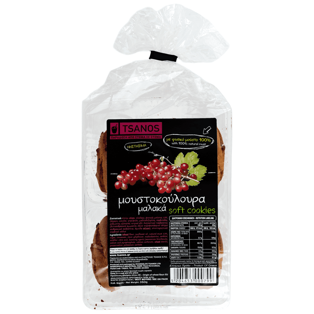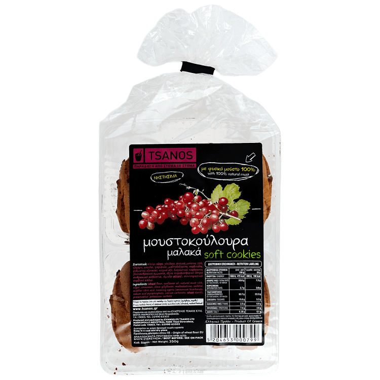Παραδοσιακά μαλακά μουστοκούλουρα, με 100% φυσικό μούστο. Ο μούστος είναι ο χυμός των σταφυλιών και περιέχει βιταμίνη Α, Β και C, αλλά και άλλα θρεπτικά συστατικά όπως σίδηρο και ασβέστιο, αποτελώντας έτσι μια σημαντική πηγή ενέργειας και βιταμινών. Τα μουστοκούλουρα Τσάνος είναι γεύση παράδοσης, αυθεντικά μουστοκούλουρα Μαρκόπουλου, είναι νηστίσιμα και ιδανικό σνακ για κάθε ώρα της μέρας. Σε πρακτική συσκευασία για μεταφορά και διατήρηση.