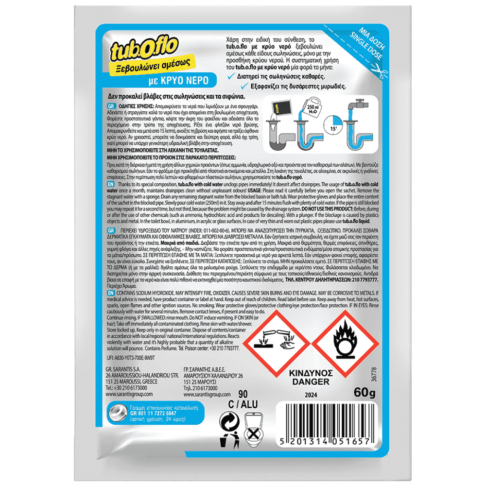 Χάρη στην ειδική του σύνθεση το Tub.o.flo με κρύο νερό ξεβουλώνει αμέσως κάθε είδους σωληνώσεις, μόνο με την προσθήκη κρύου νερού. Η συστηματική χρήση του Tub.o.flo με κρύο νερό μια φορά το μήνα: 1)Διατηρεί της σωληνώσεις καθαρές. 2) Εξαφανίζει τις δυσάρεστες μυρωδιές. Δεν προκαλεί βλάβες στις σωληνώσεις και τα σιφώνια.