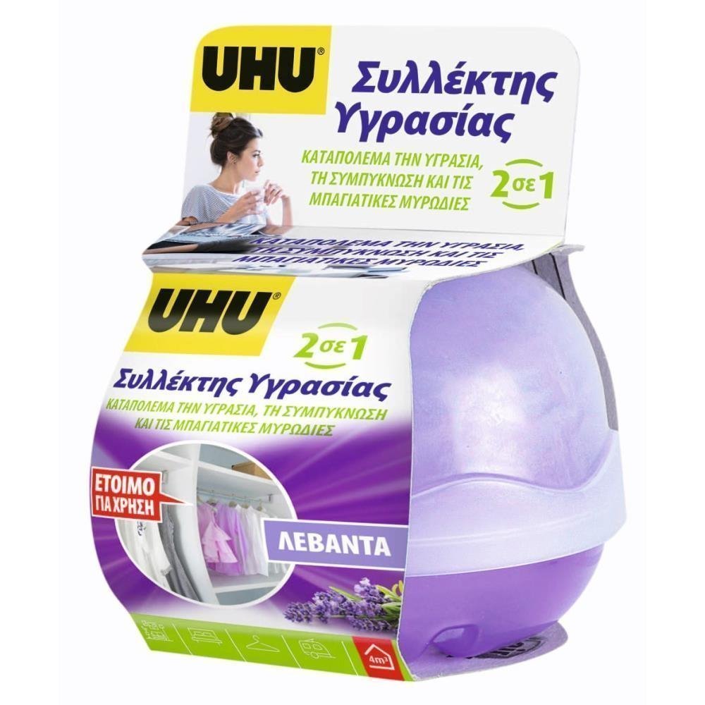 Uhu συλλέκτης υγρασίας με άρωμα λεβάντα 40gr μειώνει την υπερβολική σχετική υγρασία σε μικρούς (κλειστούς) χώρους με λίγο ή καθόλου εξαερισμό μέχρι 43m. κατάλληλο, μεταξύ άλλων, για ντουλάπες, αποθηκευτικούς χώρους τροφίμων, χρηματοκιβώτια, ντουλάπια κουζ