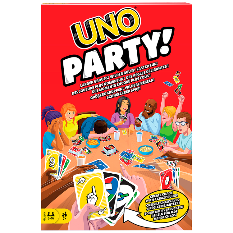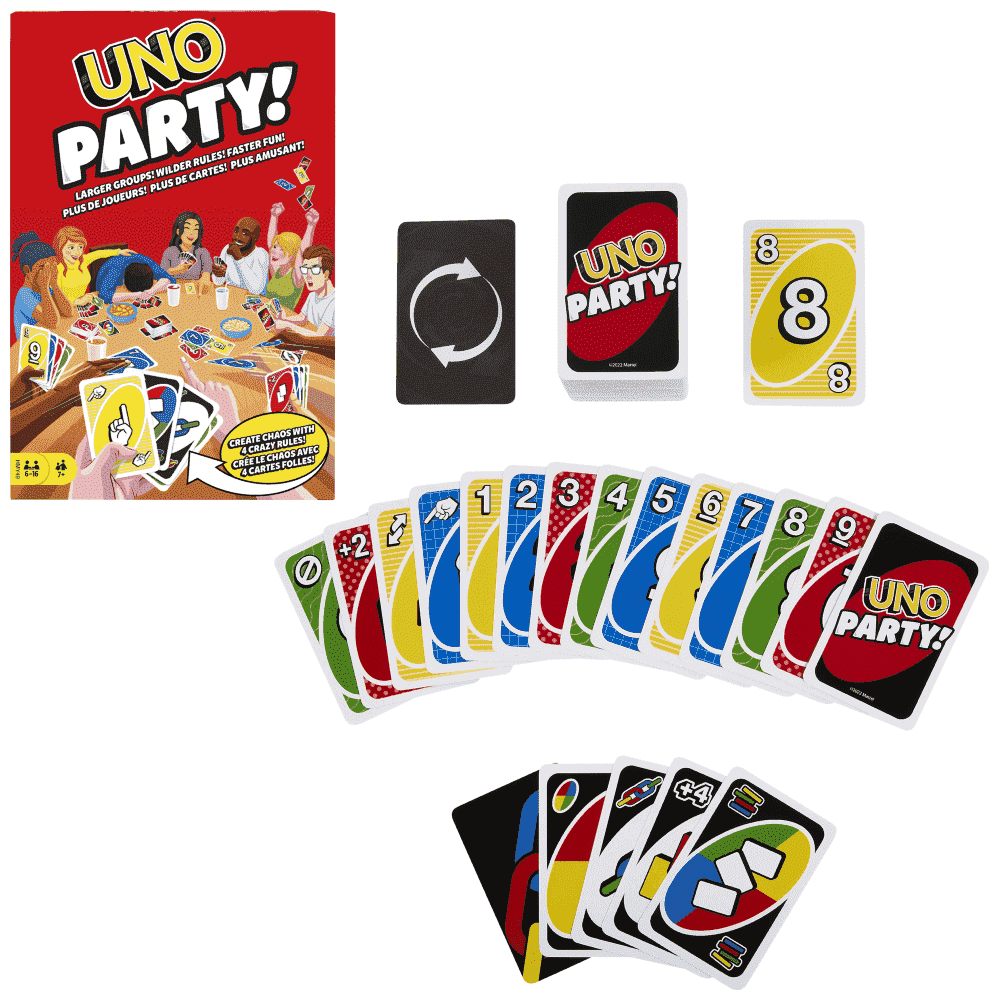 Μαζευτείτε όλοι γύρω από το τραπέζι για UNO Party! Το κλασικό παιχνίδι UNO, που οι παίκτες γνωρίζουν και αγαπούν, με επιπλέον κάρτες και ειδικούς κανόνες που έχουν σχεδιαστεί ειδικά για μεγάλες ομάδες!