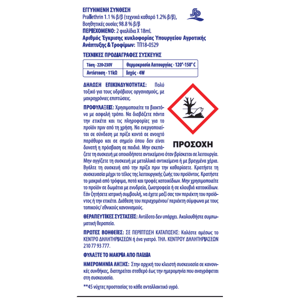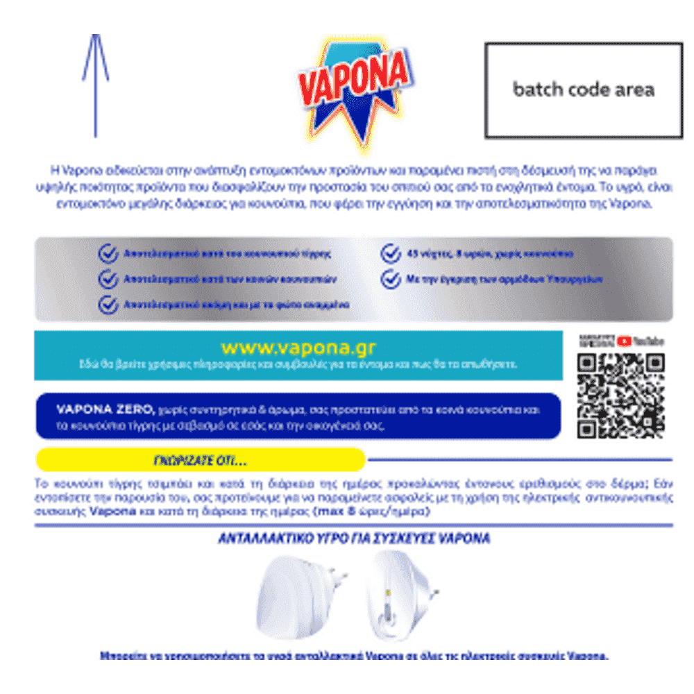 Το ανταλλακτικό υγρό Vapona ZERO, καταπολεμά αποτελεσματικά κοινά κουνούπια και κουνούπια τίγρης, μύγες & σκνίπες. To κάθε φιαλίδιο έχει ισχύ έως και 45 νύχτες και δεν περιέχει άρωμα και συντηρητικά, ενώ χάρη στο συστατικό Bitrex συμβάλλει στην προστασία των παιδιών από την κατά λάθος κατάποση.