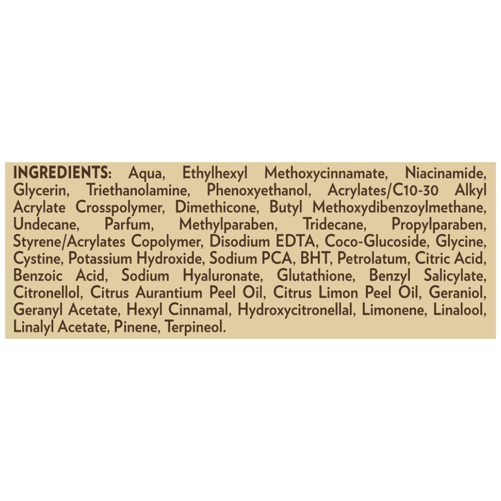 "Aqua, Ethylhexyl Methoxycinnamate, Niacinamide, Glycerin, Triethanolamine, Phenoxyethanol, Acrylates/C10-30 Alkyl Acrylate Crosspolymer, Dimethicone, Butyl Methoxydibenzoylmethane, Undecane, Parfum, Methylparaben, Tridecane, Propylparaben, Styrene/Acrylates Copolymer, Disodium EDTA, Coco-Glucoside, Glycine, Cystine, Potassium Hydroxide, Sodium PCA, BHT, Petrolatum, Citric Acid, Benzoic Acid, Sodium Hyaluronate, Glutathione, Benzyl Salicylate, Citronellol, Citrus Aurantium Peel Oil, Citrus Limon Peel Oil, Geraniol, Geranyl Acetate, Hexyl Cinnamal, Hydroxycitronellal, Limonene, Linalool, Linalyl Acetate, Pinene, Terpineol."