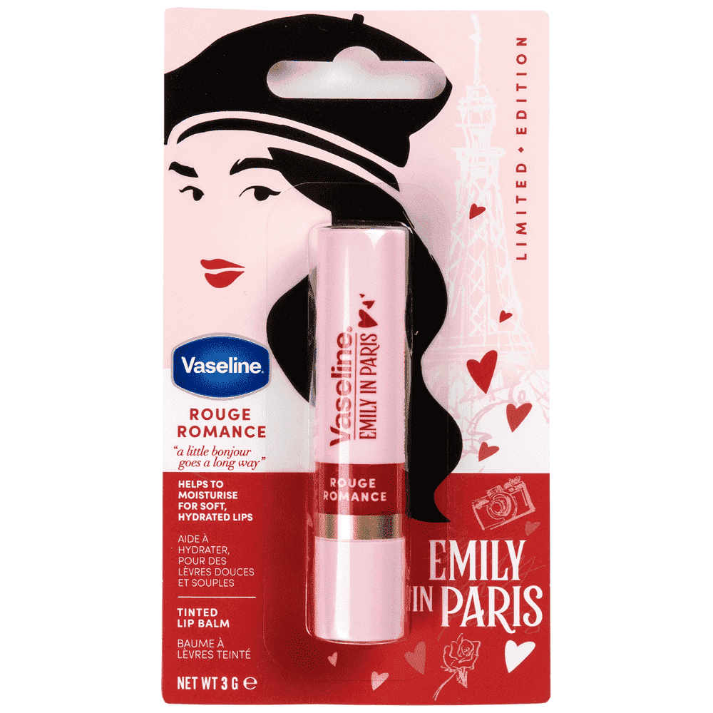 Tα νέα Vaseline Lip Balms συνδυάζουν έντονο χρώμα και τις θεραπευτικές ιδιότητες της βαζελίνης σε μια μοναδική συσκευασία Emily in Paris. Αποτελούν ένα χαριτωμένο & fancy αξεσουάρ και αναδεικνύουν με τον μοναδικά τολμηρό τρόπο της Emily in Paris τα χείλη σας.