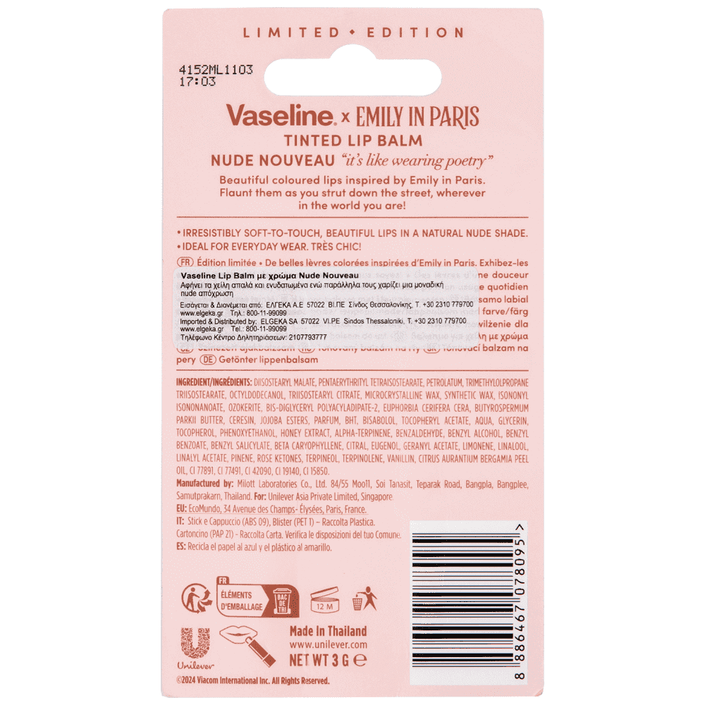 Tα νέα Vaseline Lip Balms συνδυάζουν έντονο χρώμα και τις θεραπευτικές ιδιότητες της βαζελίνης σε μια μοναδική συσκευασία Emily in Paris. Αποτελούν ένα χαριτωμένο & fancy αξεσουάρ και αναδεικνύουν με τον μοναδικά τολμηρό τρόπο της Emily in Paris τα χείλη σας.