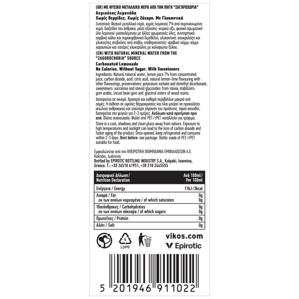Η Λεμονάδα "Βίκος" είναι η μόνη με Φυσικό Μεταλλικό Νερό από την πηγή Ζαγοροχώρια. Περιέχει 7% φυσικό χυμό λεμονιού. 0% ζάχαρη! Περιέχει γλυκαντικό από το φυτό στέβια.
