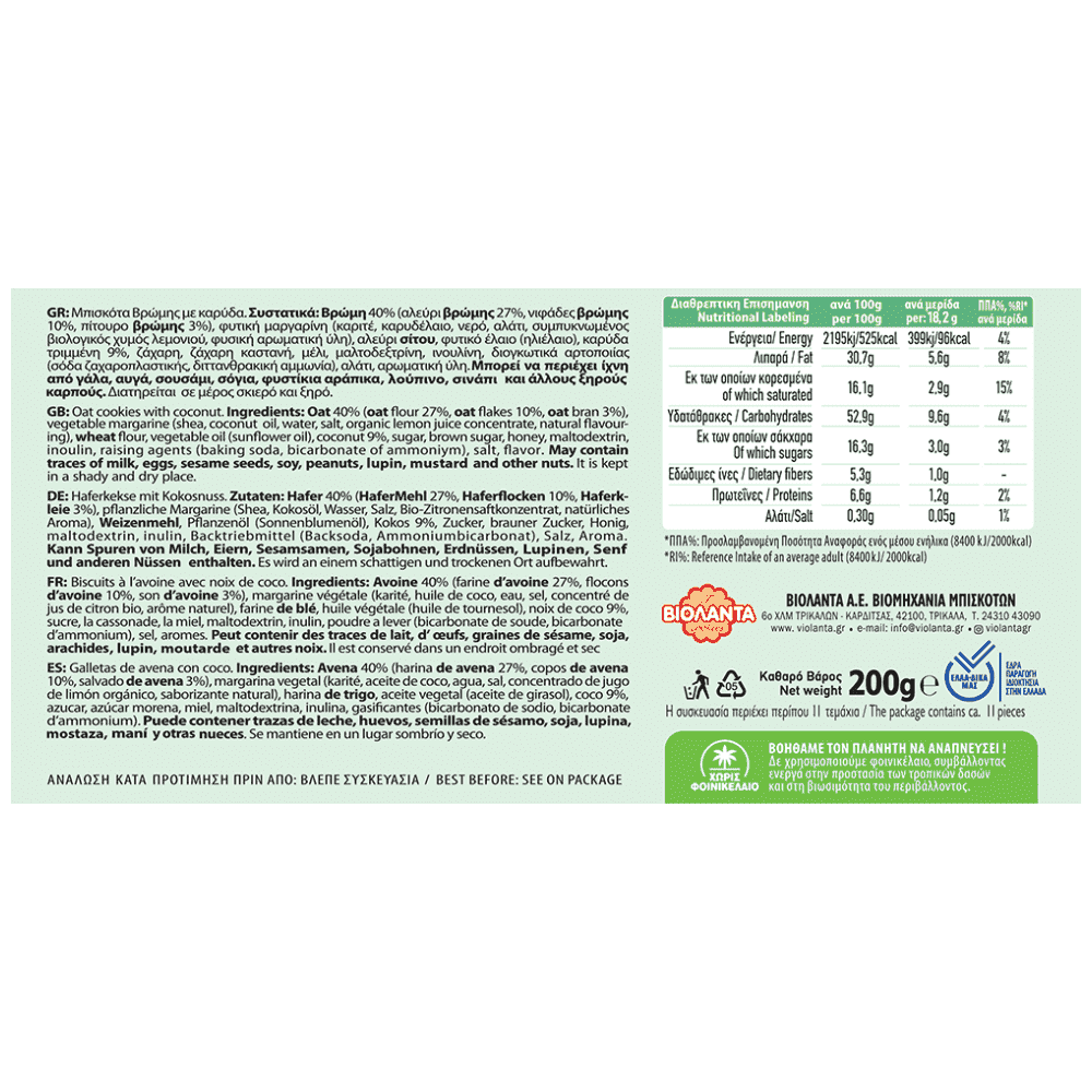 Βρώμη 40% (αλεύρι βρώμης 27 %, νιφάδες βρώμης 10 %, πίτυρο βρώμης 3%), φυτική μαργαρίνη (καριτέ, καρυδέλαιο, νερό, αλάτι, συμπυκνωμένος βιολογικός χυμός λεμονιού , φυσική αρωματική ύλη ), αλεύρι σίτου, φυτικό έλαιο (ηλιέλαιο), καρύδα τριμμένη 9%, ζάχαρη, ζάχαρη καστανή, μέλι, μαλτοδεξτρίνη, ινουλίνη, διογκωτικά αρτοποιίας (διττανθρακική σόδα , διττανθρακικό αμμώνιο), αλάτι, αρωματική ύλη.