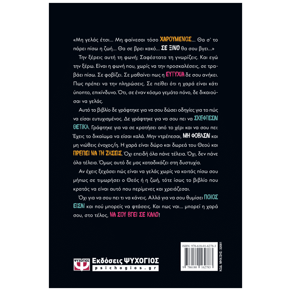 «Μη γελάς έτσι; Μη φαίνεσαι τόσο ΧΑΡΟΥΜΕΝΟΣ; Θα σ’ το πάρει πίσω η ζωή; Θα σε βρει κακό; ΣΕ ΞΙΝΟ θα σου βγει;» Την ξέρεις αυτή τη φωνή; Σαφέστατα τη γνωρίζεις. Και εγώ την ξέρω. Είναι η φωνή που, χωρίς να την προσκαλέσεις, σε τραβάει πίσω. Σε φοβίζει. Σε μαθαίνει πως η ΕΥΤΥΧΙΑ δε σου ανήκει. Πως πρέπει να την πληρώσεις. Σε πείθει ότι η χαρά είναι κάτι ύποπτο, επικίνδυνο. Ότι, σε έναν κόσμο γεμάτο πόνο, δε δικαιούσαι να γελάς. Αυτό το βιβλίο δε γράφτηκε για να σου δώσει οδηγίες για το πώς να είσαι ευτυχισμένος. Δε γράφτηκε για να σου πει να ΣΚΕΦΤΕΣΑΙ ΘΕΤΙΚΑ. Γράφτηκε για να σε κρατήσει από το χέρι και να σου πει: Έχεις το δικαίωμα να είσαι καλά. Μην ντρέπεσαι, ΜΗ ΦΟΒΑΣΑΙ και μη νιώθεις ένοχος/η. Η χαρά είναι δώρο και δωρεά του Θεού και ΠΡΕΠΕΙ ΝΑ ΤΗ ΖΗΣΕΙΣ. Όχι επειδή όλα πάνε τέλεια. Όχι, δεν πάνε όλα τέλεια. Όμως αυτό δε μας καταδικάζει στη δυστυχία. Αν έχεις ξεχάσει πώς είναι να γελάς χωρίς να κοιτάς πίσω σου μήπως σε τιμωρήσει ο Θεός ή η ζωή, τότε ίσως το βιβλίο που κρατάς να είναι αυτό που περίμενες και χρειάζεσαι. Όχι για να σου πει τι να κάνεις. Αλλά για να σου θυμίσει ΠΟΙΟΣ ΕΙΣΑΙ και πού μπορείς να φτάσεις. Και πως ναι; μπορεί η χαρά σου, στο τέλος, ΝΑ ΣΟΥ ΒΓΕΙ ΣΕ ΚΑΛΟ!