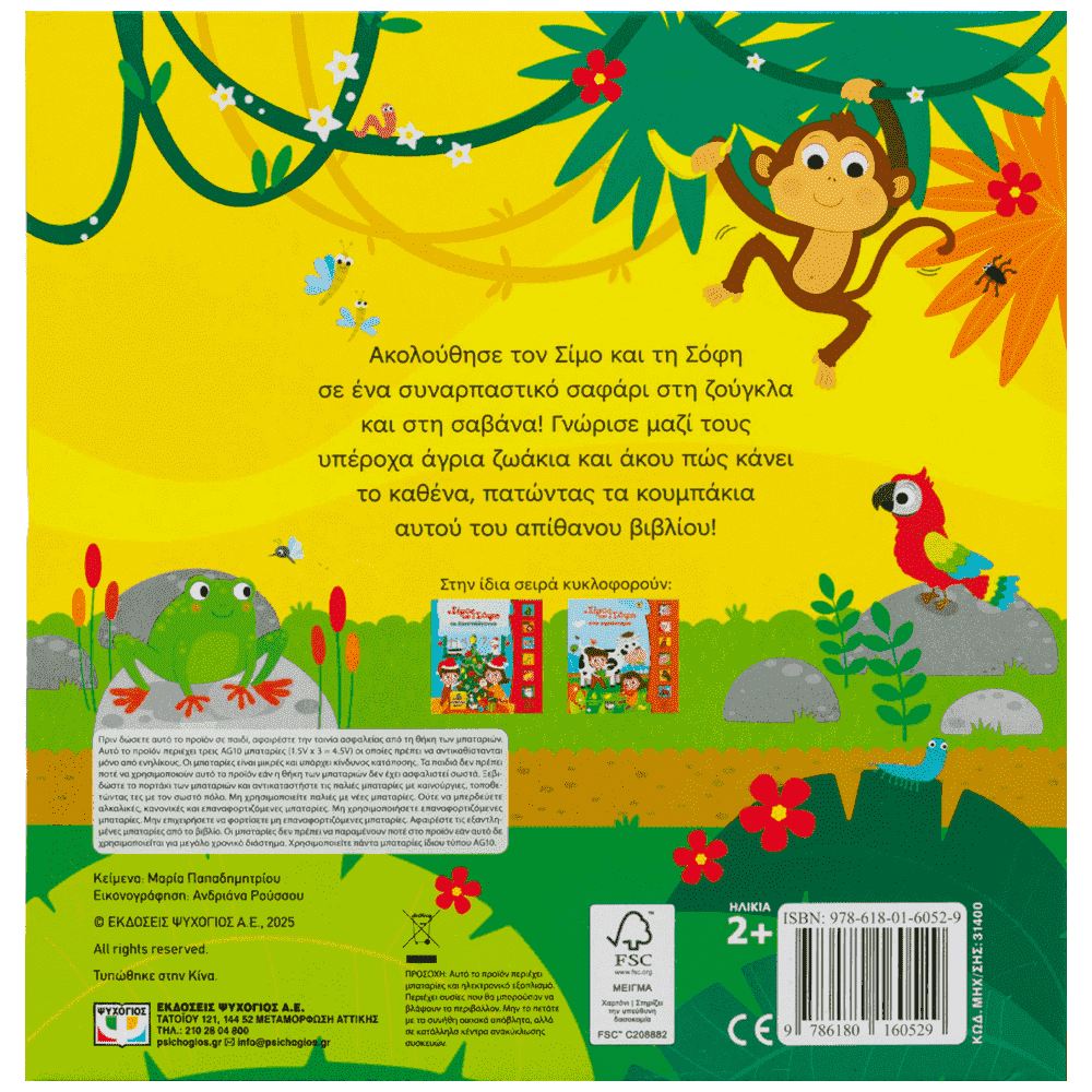 Ακολούθησε τον Σίμο και τη Σόφη σε ένα συναρπαστικό σαφάρι στη ζούγκλα και στη σαβάνα! Γνώρισε μαζί τους υπέροχα άγρια ζωάκια και άκου πώς κάνει το καθένα, πατώντας τα κουμπάκια αυτού του απίθανου βιβλίου!