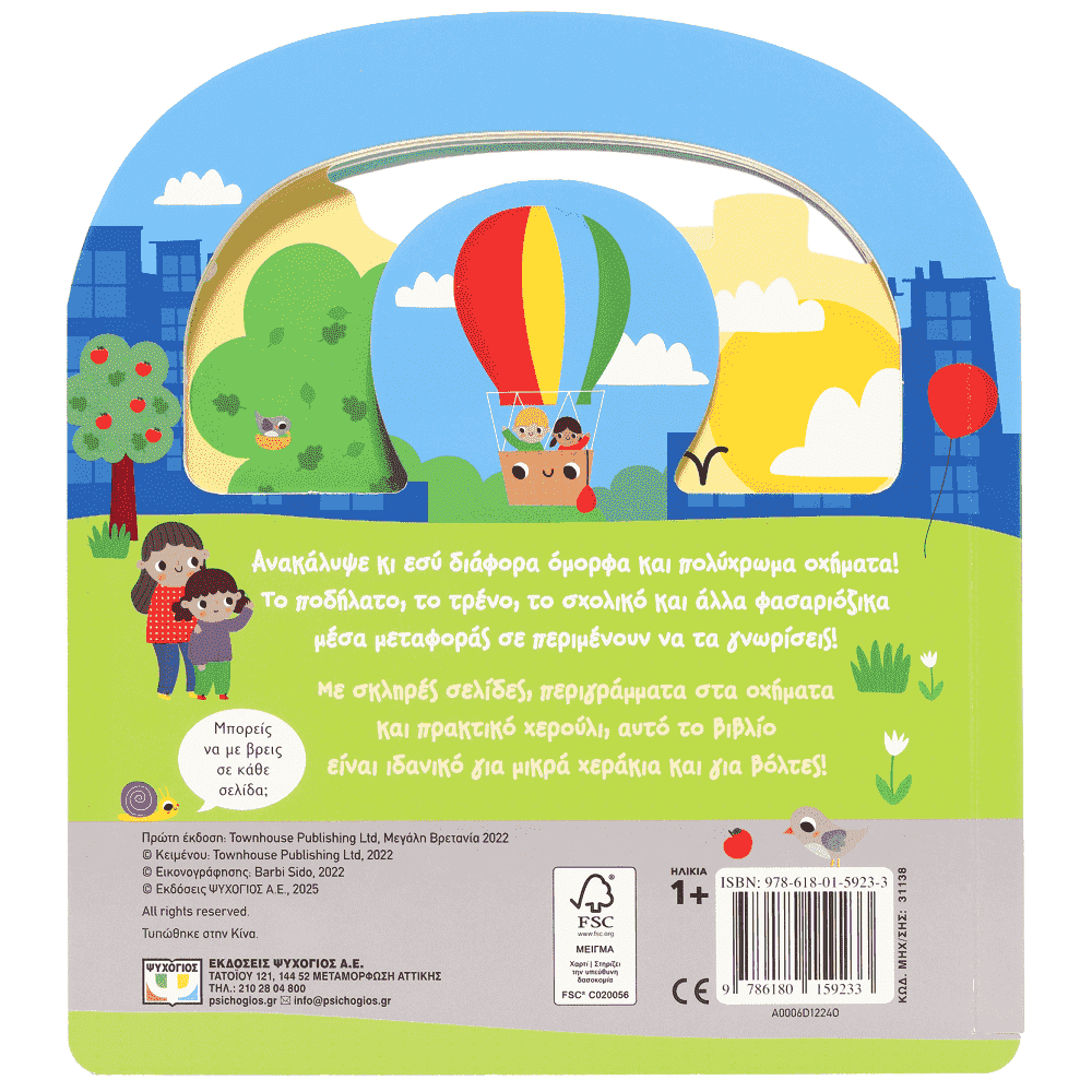 Ανακάλυψε κι εσύ διάφορα όμορφα και πολύχρωμα οχήματα! Το ποδήλατο, το τρένο, το σχολικό και άλλα φασαριόζικα μέσα μεταφοράς σε περιμένουν να τα γνωρίσεις! Με σκληρές σελίδες, περιγράμματα στα οχήματα και πρακτικό χερούλι, αυτό το βιβλίο είναι ιδανικό για μικρά χεράκια και για βόλτες!