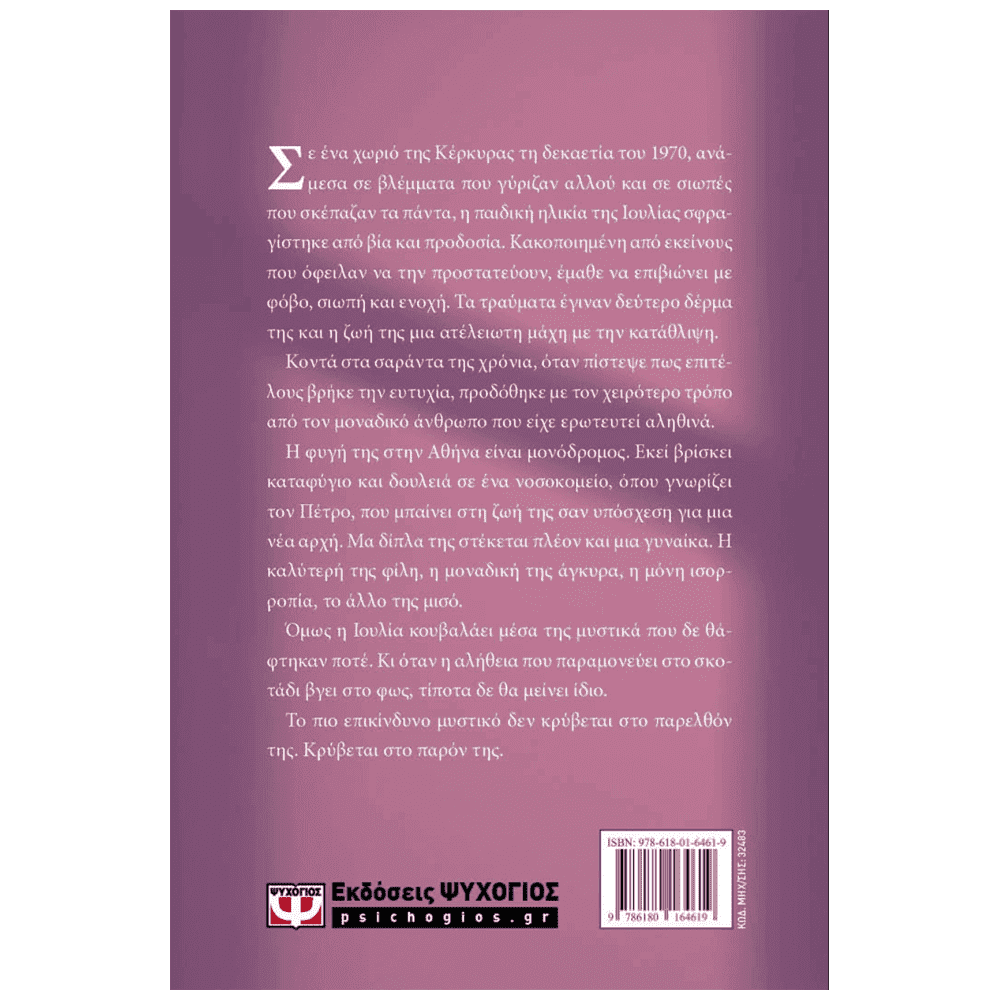 Σε ένα χωριό της Κέρκυρας τη δεκαετία του 1970, ανάμεσα σε βλέμματα που γύριζαν αλλού και σε σιωπές που σκέπαζαν τα πάντα, η παιδική ηλικία της Ιουλίας σφραγίστηκε από βία και προδοσία. Κακοποιημένη από εκείνους που όφειλαν να την προστατεύουν, έμαθε να επιβιώνει με φόβο, σιωπή και ενοχή. Τα τραύματα έγιναν δεύτερο δέρμα της και η ζωή της μια ατέλειωτη μάχη με την κατάθλιψη.