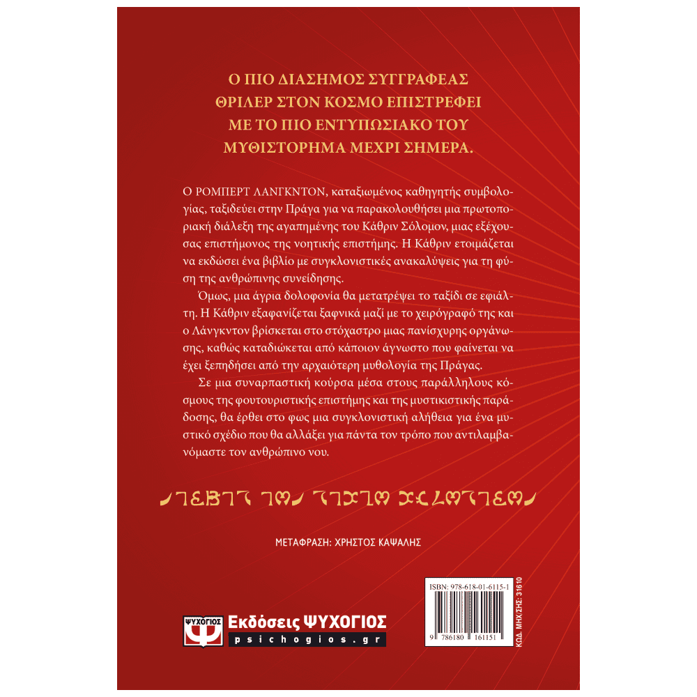 Ημ/νία έκδοσης27 Νοε 2025 Θεματική ΚατηγορίαΘρίλερ - Περιπέτεια ΣειράΞένη λογοτεχνία ΤύποςΜυθιστόρημα Ηλικία18+ Σελίδες944 ΜεταφραστήςΧρήστος Καψάλης ISBN978-618-01-6115-1 Κωδικός31610 Σχήμα (πλάτος x ύψος)14 x 21 cm Βάρος0.809 kgr ΒιβλιοδεσίαΜαλακό εξώφυλλο ISBN e-book978-618-01-6116-8 Κωδικός e-book31611 Ο πιο διάσημος συγγραφέας θρίλερ στον κόσμο επιστρέφει με το πιο εντυπωσιακό του μυθιστόρημα μέχρι σήμερα. Ο Ρόμπερτ Λάνγκντον, καταξιωμένος καθηγητής συμβολογίας, ταξιδεύει στην Πράγα για να παρακολουθήσει μια πρωτοποριακή διάλεξη της αγαπημένης του Κάθριν Σόλομον, μιας εξέχουσας επιστήμονος της νοητικής επιστήμης. Η Κάθριν ετοιμάζεται να εκδώσει ένα βιβλίο με συγκλονιστικές ανακαλύψεις για τη φύση της ανθρώπινης συνείδησης. Όμως, μια άγρια δολοφονία θα μετατρέψει το ταξίδι σε εφιάλτη. Η Κάθριν εξαφανίζεται ξαφνικά μαζί με το χειρόγραφό της και ο Λάνγκντον βρίσκεται στο στόχαστρο μιας πανίσχυρης οργάνωσης, καθώς καταδιώκεται από κάποιον άγνωστο που φαίνεται να έχει ξεπηδήσει από την αρχαιότερη μυθολογία της Πράγας. Σε μια συναρπαστική κούρσα μέσα στους παράλληλους κόσμους της φουτουριστικής επιστήμης και της μυστικιστικής παράδοσης, θα έρθει στο φως μια συγκλονιστική αλήθεια για ένα μυστικό σχέδιο που θα αλλάξει για πάντα τον τρόπο που αντιλαμβανόμαστε τον ανθρώπινο νου.
