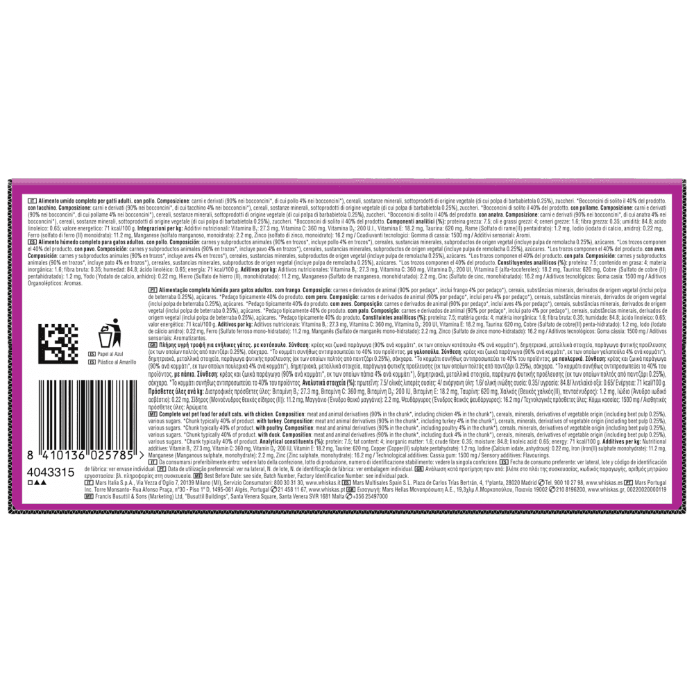 Η καταγραφή των θερμίδων προέρχεται από λιχουδιές. Η ποσότητα της τροφής παρέχεται μόνο ως οδηγός. Προσαρμόστε την ποσότητα της τροφής ανάλογα με την ηλικία, το μέγεθος και το επίπεδο δραστηριότητας της γάτας σας. Μοιράστε σε μερίδες για να ταΐζετε σε όλη τη διάρκεια της ημέρας. Για περισσότερες πληροφορίες, επισκεφθείτε το site. Προσφέρετε φρέσκο νερό. Σερβίρετε σε θερμοκρασία δωματίου και διατηρήστε στο ψυγείο τυχόν περίσσευμα τροφής έως 2 ημέρεςΠληροφορίες Προμηθευτή