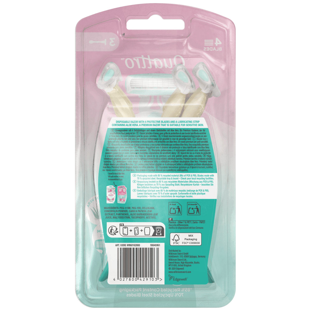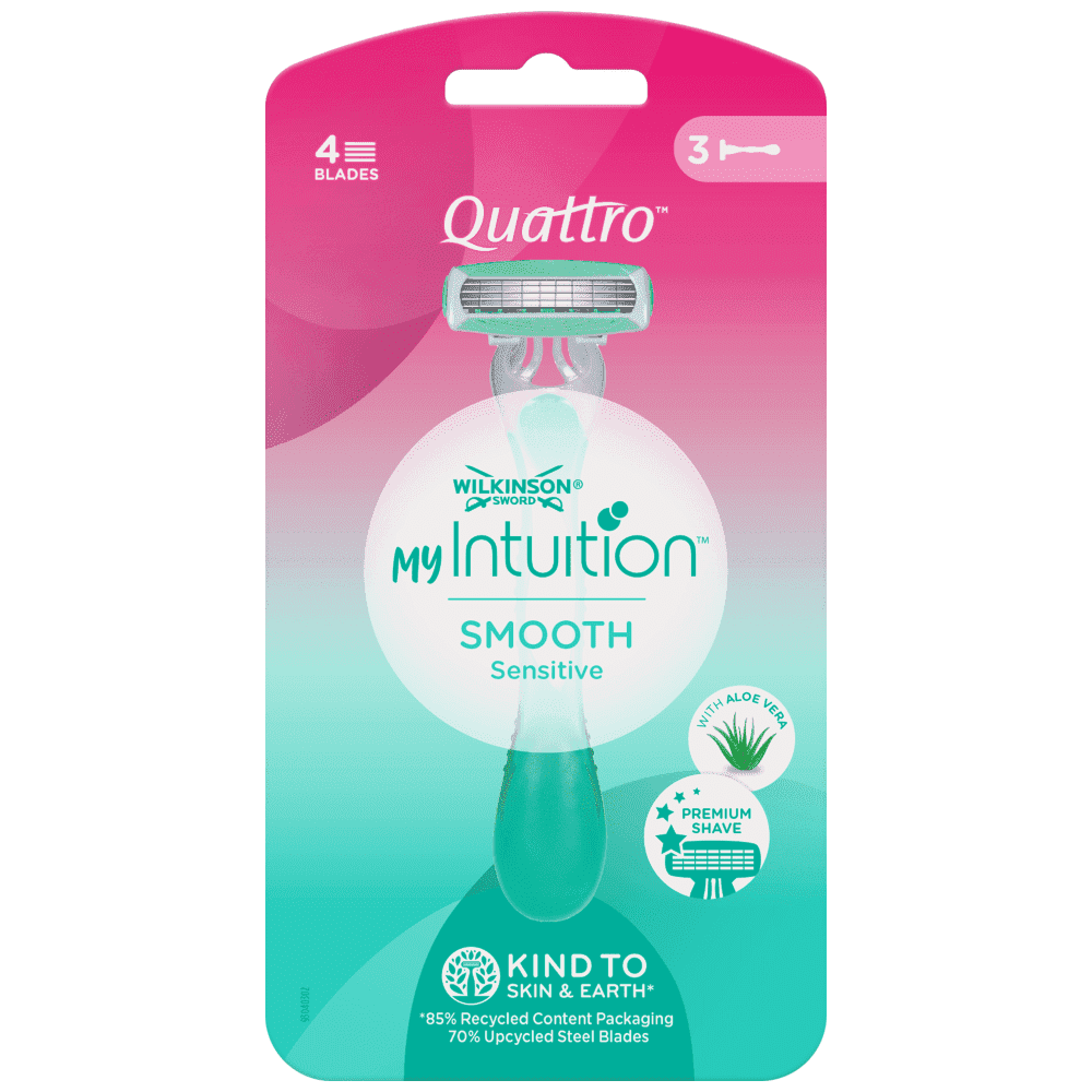 Η ξυριστική μηχανή myIntuition Smooth Sensitive Quattro Disposable παρέχει εξαιρετική απόδοση σε μια ξυριστική μηχανή μιας χρήσης με τέσσερις λεπίδες. Τέσσερις υπερβολικά λεπτές λεπίδες παρέχουν μια εξαιρετικά κοντινή και άνετη ξυρίσματα με τη μορφή της μίας μη αναστρέψιμης ξυριστικής μηχανής. Ο προστατευτικός φραγμός κατά των λεπίδων προστατεύει από κοψίματα και γρατζουνιές. Δύο λωρίδες λιπαντικού είναι εμπλουτισμένες με Αλόη και Βιταμίνη Ε σε μια περιστρεφόμενη κεφαλή για ομαλή ολίσθηση και άνετο ξύρισμα. Βελτιώνουμε τη ρουτίνα ξυρίσματος σας με μια εργονομική λαβή από καουτσούκ και πολλαπλές θέσεις για τα δάχτυλα για να ενισχύσουμε την πρόσφυση και τον έλεγχο. Τα κύρια συστατικά της ξυριστικής μηχανής προέρχονται από υπολείμματα ξύλου. Πλήρως ανακυκλώσιμες συσκευασίες.