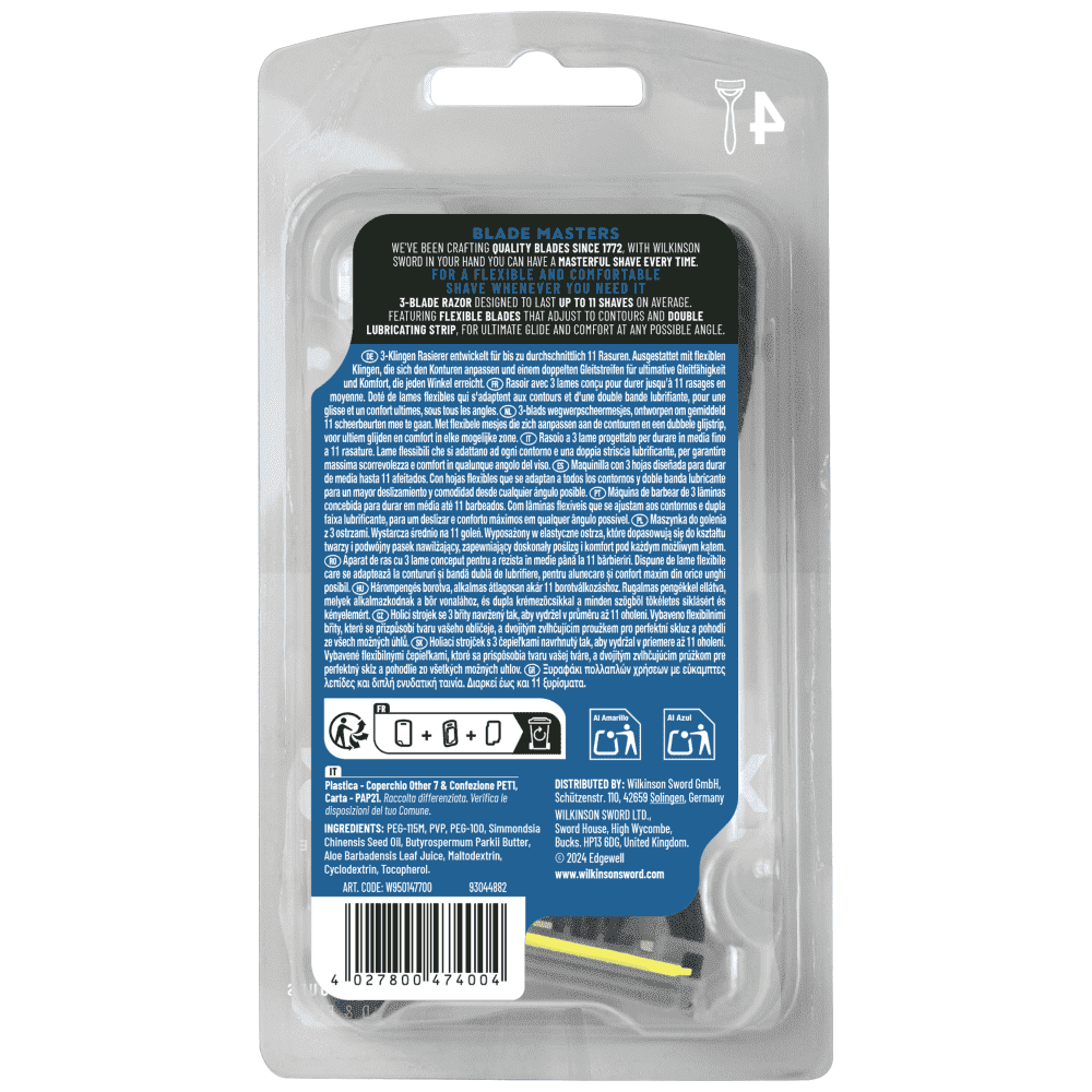 Η ξυριστική μας μηχανή μίας χρήσης 3 λεπίδων διαθέτει μοναδικές εύκαμπτες λεπίδες που προσαρμόζονται ιδανικά στις καμπύλες του κεφαλιού και του προσώπου, εξασφαλίζοντας μια ακριβή και άνετη ολίσθηση. Λιπαντική ταινία ultimate με διπλή λιπνατική ταινία. Όχι πια μίας χρήσης, με λεπίδες σχεδιασμένες να διαρκούν μέχρι 11 ξυρίσματα κατά μέσο όρο.Η λαβή του ξυραφιού είναι φτιαγμένη από 35% ανακυκλωμένο πλαστικό (mix of PCR & PIR). Kατασκευασμένη από 85% ανακυκλωμένα υλικά (μείγμα PCR & PIR). Το δισκάκι και η κάρτα είναι ανακυκλώσιμα, ελέγξτε τις τοπικές εγκαταστάσεις ανακύκλωσης.